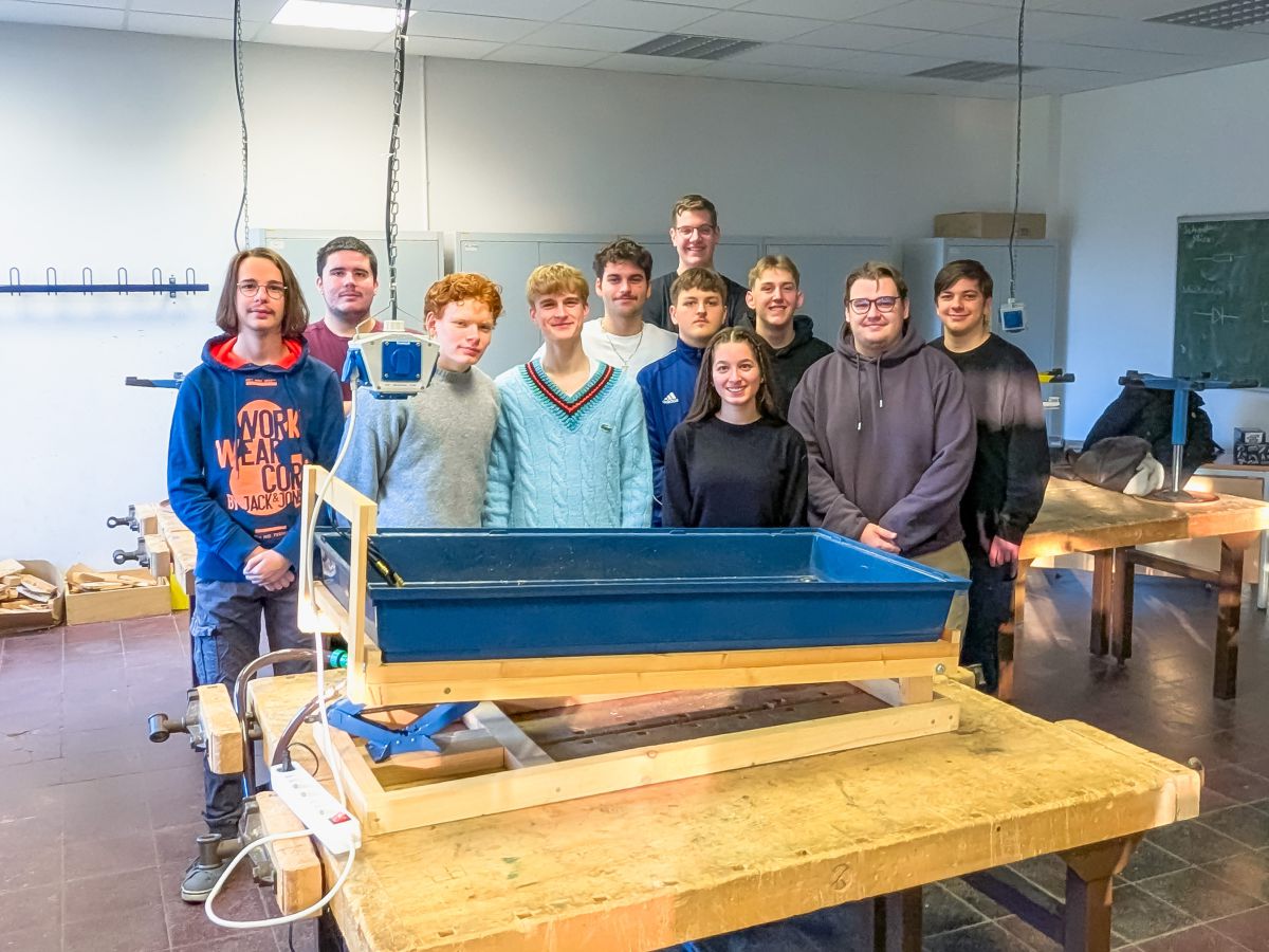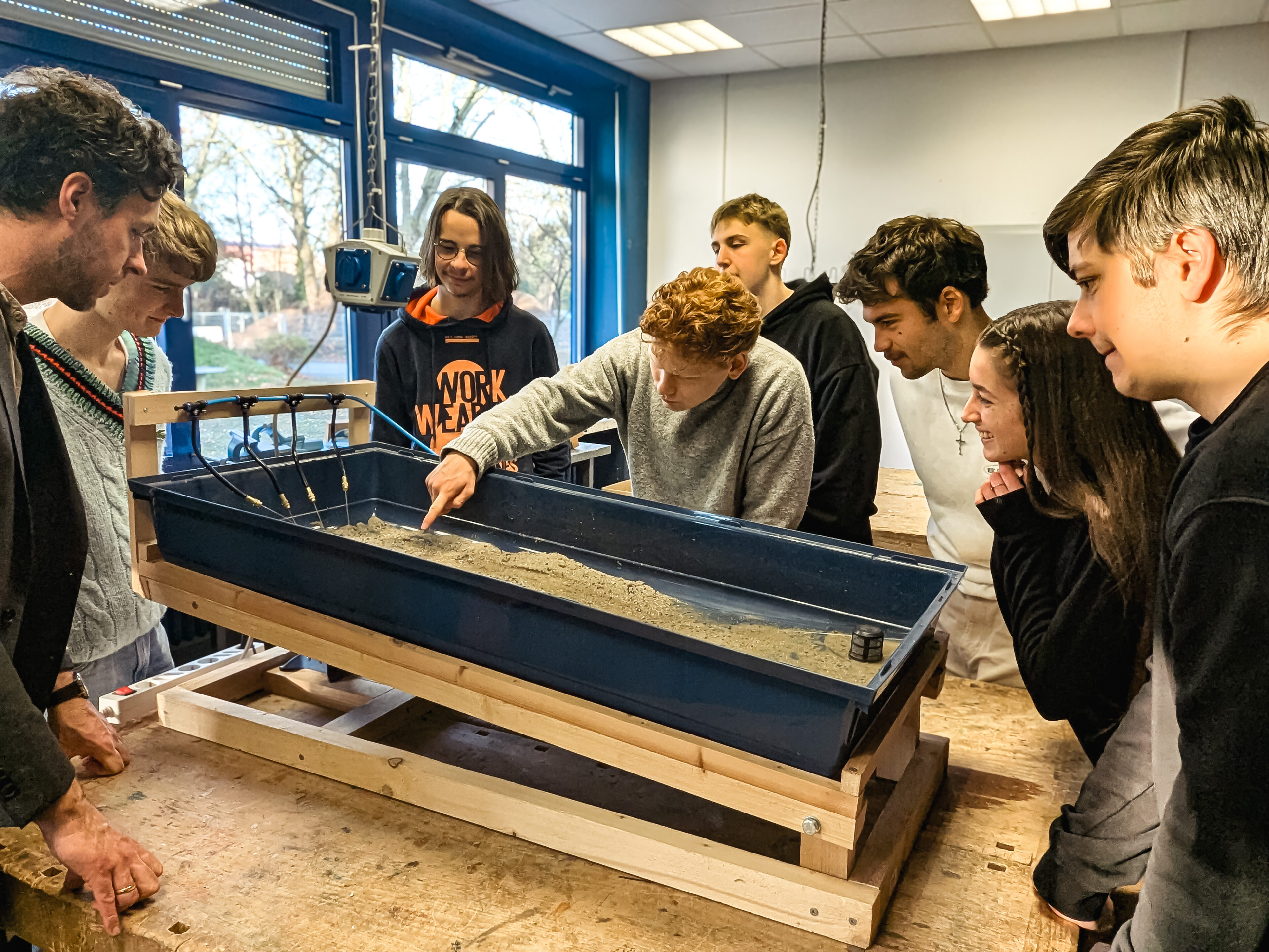 Das Ergebnis ist ein sogenannter Stream Table, ein Modell, das den Wasserkreislauf und Flussläufe simuliert. Über vier steuerbare Düsen lassen sich unterschiedliche Strömungsstärken erzeugen, wodurch Sedimentation und Erosion sichtbar werden. Sand und Kies verändern sich durch den Wasserdruck, verschiedene Flussläufe entstehen und der Weg von der Quelle bis hin zu einem See oder Meer wird anschaulich dargestellt. Ein Wagenheber ermöglicht zudem die Simulation von Gefälle oder starkem Wellengang.